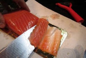 - Tapisser le formulaire avec un film plastique. Mettez une couche de pâte sur le fond. Ensuite, une couche de masse de fromage et une couche de poisson. Recueillir des couches dans cet ordre les lasagnes. Couche supérieure en pâte.