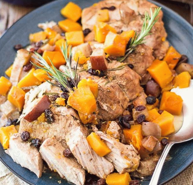 Mettez le longe fini juteux sur une assiette, ajoutez autour citrouille au four, oignons, pommes et servir immédiatement.