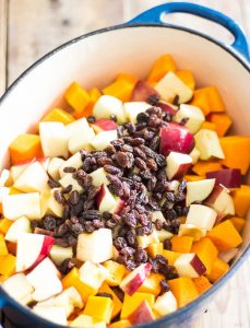 Couper les pommes pelées et la citrouille en cubes, les envoyer à la viande avec les oignons. Saupoudrer de raisins secs lavés.