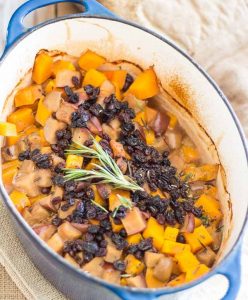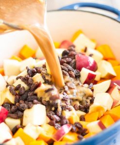 Incroyablement délicieux et beau plat de longe de porc au four avec citrouille, pommes, raisins secs et oignons en sauce à partir de bouillon de viande, de vinaigre de cidre de pomme et de moutarde.