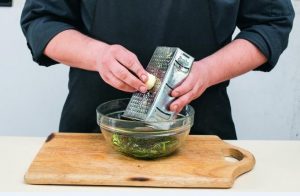 - Pétrir les verts avec vos mains, casser les tiges à plusieurs endroits. Mettez-les dans du jus de pomme. Frotter l’ail sur une râpe fine et ajouter au jus.