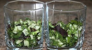 - Une telle okrochka peut être servie dans des verres. Répandre en eux concombres avec des herbes, ajouter une pincée de sel.