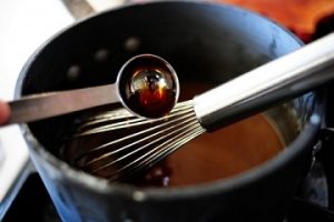 - Faire fondre le beurre, brunir à feu doux sucre et vanille. Cuire le sirop jusqu’à épaississement pendant 15-20 minutes, constamment en remuant.