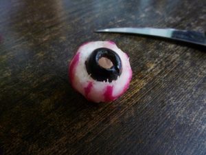 - D’une part, couper un évidement pour la moitié de l’olive. Prenez des olives dénoyautées.