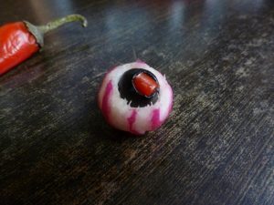 - Mon radis, avec un couteau tranchant et fin, nettoie la peau de sorte qu’il ressemble à des vaisseaux rouges.