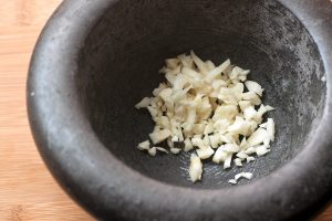 - Frotter l’ail avec du sel dans un mortier.