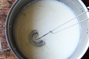 - Faire fondre le beurre dans une casserole ou une casserole séparée, Ajouter un verre d’eau de pâtes, crème, vin, sel et poivre. Nous nous réchauffons.