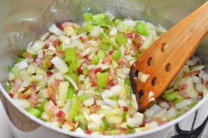- Dans une casserole au fond épais ou au wok, verser l’olive et le beurre et chauffer, ajouter les oignons, le céleri, l’ail, bacon et frire jusqu’à coloration dorée.