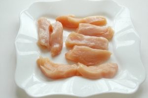 Couper le poulet en lanières et laisser mariner avec les épices. Pour Vous pouvez prendre des herbes de curcuma ou de Provence.