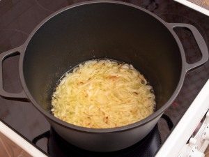 - Dans un chaudron, faire revenir les oignons dans une grande quantité d’huile (200 ml), en tranches, de couleur paille.