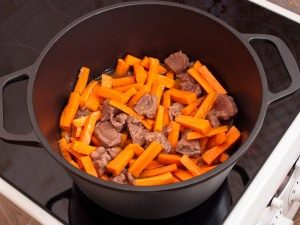 - Cinq minutes plus tard, ajoutez les carottes, coupées en cubes, laisser mijoter pendant sept minutes en remuant et en ne couvrant pas.