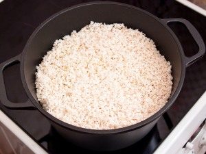 - Versez de l’eau chaude sur le riz deux cm en un mince filet. Légèrement sel. Couvrir et cuire jusqu’à ce que le riz soit plein n’absorbe pas l’eau.