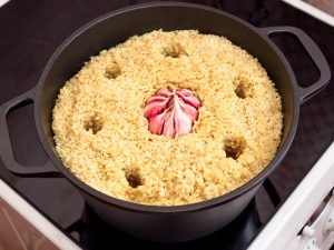- Ensuite, placez l’ail au centre du chaudron, en pressant ses vries, baguette pour faire des trous pour la sortie de vapeur. Fermez le couvercle et laisser reposer 25 minutes à feu doux.