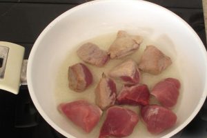 Rincer le porc, le dépouiller des veines et couper moyen un cube. Faites frire la viande dans une grande quantité d’huile.