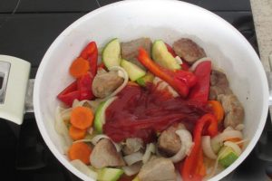 Poivrons, carottes et oignons, pelés et hachés assez gros en morceaux. Jeter les légumes à la viande et les faire frire quand les légumes sera presque prêt à mettre la pâte de tomate, remuer, réduire feu au minimum.