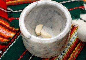 - Broyer l’ail dans un mortier et le mettre à l’oignon.