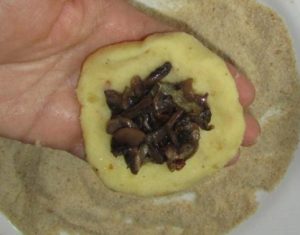- De la pomme de terre hachée nous faisons des gâteaux, mis au milieu farce aux champignons et aux oignons, replier les bords des gâteaux aux pommes de terre centre et proche.