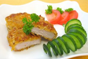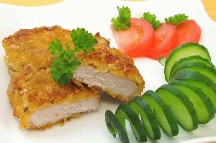 Très simple et rapide à cuisiner à la maison plat de porc. Il se révèle délicieux, juteux, croustillant. les biscuits peuvent ajouter vos herbes séchées préférées, telles que le romarin, aneth, persil. Assurez-vous de servir une salade de Légumes frais et tomates, concombres et feuilles hachés salade verte Sur le plat d’accompagnement, vous pouvez faire bouillir des pommes de terre, du riz.