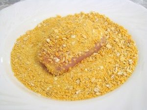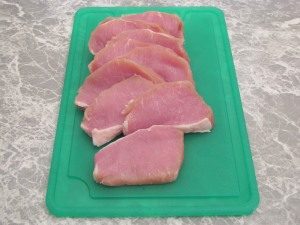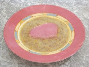 - Roulez des tranches de porc tranchées dans des assiettes épaisses environ un cm de mélange moutarde et moutarde.