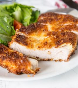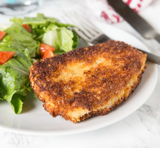 Poivre préparé salé, poivre, envoyé à la farine, aux oeufs, puis dans des biscuits. Étendre les morceaux panés dans l’huile chaude et faire frire à feu moyen pendant 4-5 minutes, jusqu’à ce que croustillant croûte brune.