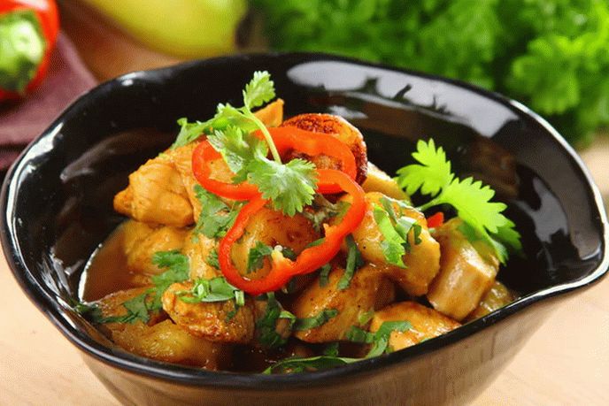 Combinez le poulet avec les bananes, ajoutez la quantité requise beurre. Faire cuire le poulet pendant 3 à 5 minutes. À Servir le plat avec de la coriandre hachée.