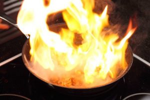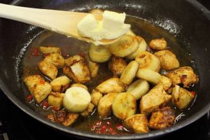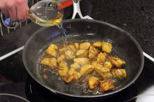Faire chauffer une poêle avec de l’huile végétale et faire frire son poulet jusqu’à coloration dorée. Après ajouter le rhum et le brûler avec un briquet, la casserole va brûler pendant plusieurs secondes, puis sortez.