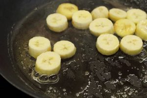 Pelez les bananes et coupez-les en rondelles dont l’épaisseur doit être ~ 1-2 centimètres. Les faire frire brièvement dans une poêle avec des légumes l’huile.
