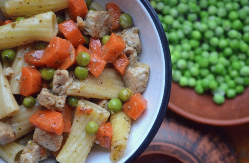 - Faire bouillir les pâtes al dente, dans une casserole ajouter les pois verts. Combinez les pâtes avec le ragoût, le sel, amener à la préparation.