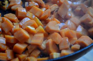 - Couper les carottes en cubes et les faire frire dans une poêle sèche. Ajouter de l’huile végétale et après quelques minutes, ajouter un demi-verre d’eau, fermez le couvercle et laissez mijoter pendant plusieurs minutes.
