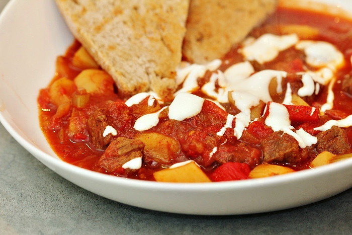 Mettez le délicieux ragoût de porc fini dans des assiettes, verser la crème sure et servir avec du pain croustillant.