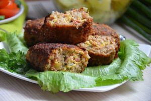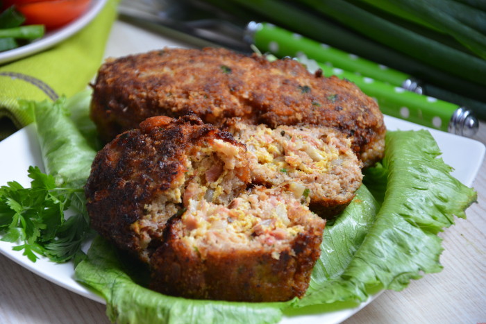 Roulés de porc hachés juteux et savoureux à la maison avec farcis de jambon frit, d’oignons et d’œufs. Spécial L’origan séché, le basilic et le persil frais ajoutent de la saveur aux petits pains. La garniture peut être faite n’importe laquelle.