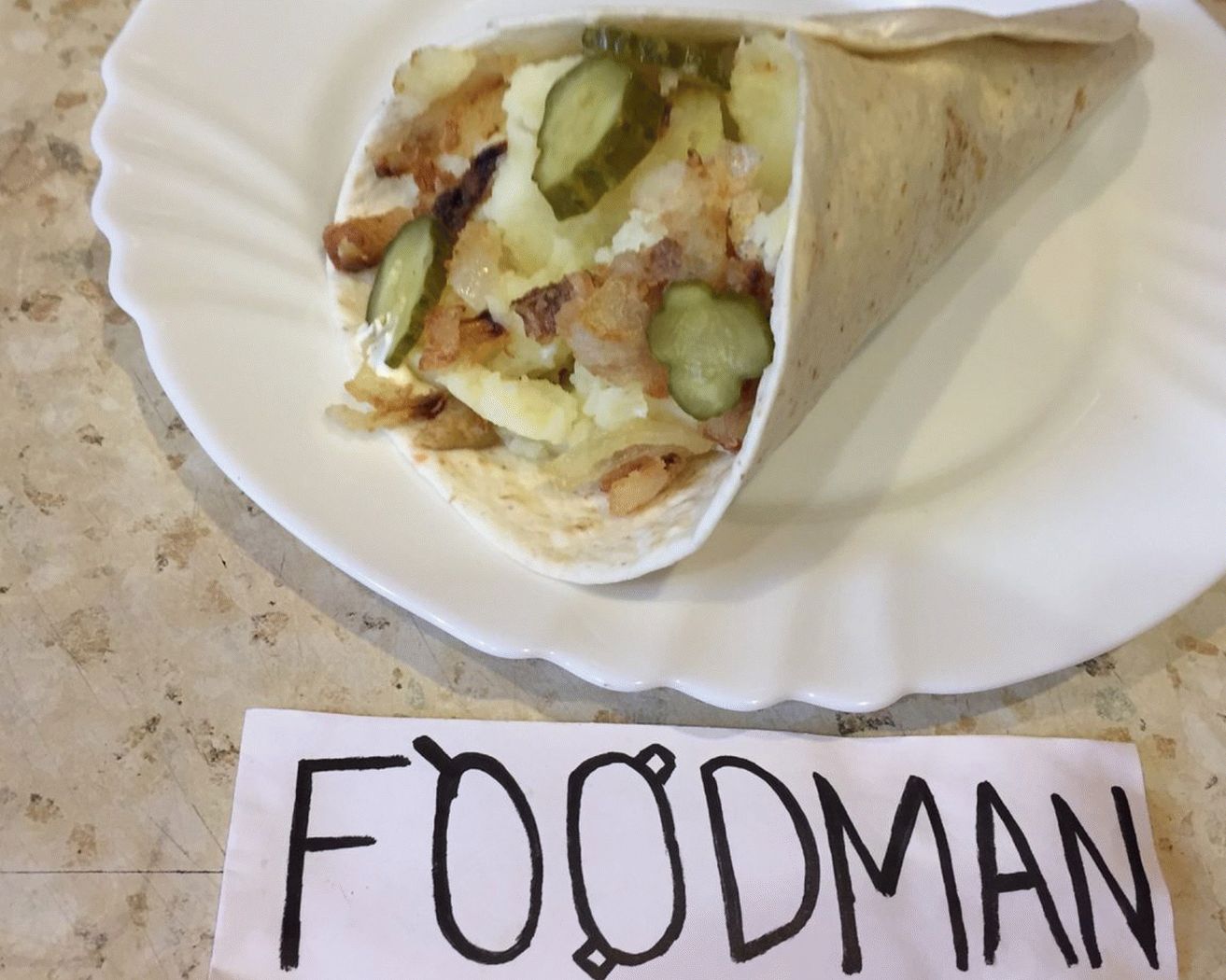 - Verser la mayonnaise, le ketchup et la moutarde dans la tortilla, mettre un couple tranches de concombre, une cuillerée d’oignons frits, une saucisse et deux cuillères purée de pommes de terre, garnis d’oignons frits et salés concombres.