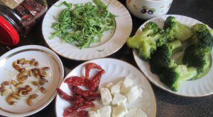 - Lavez et séchez la roquette, étalez-la sur une assiette. mettre du brocoli, de la mozzarella, des morceaux de tomates séchées au soleil, de l’eau ravitaillement. Saupoudrer de graines de citrouille.