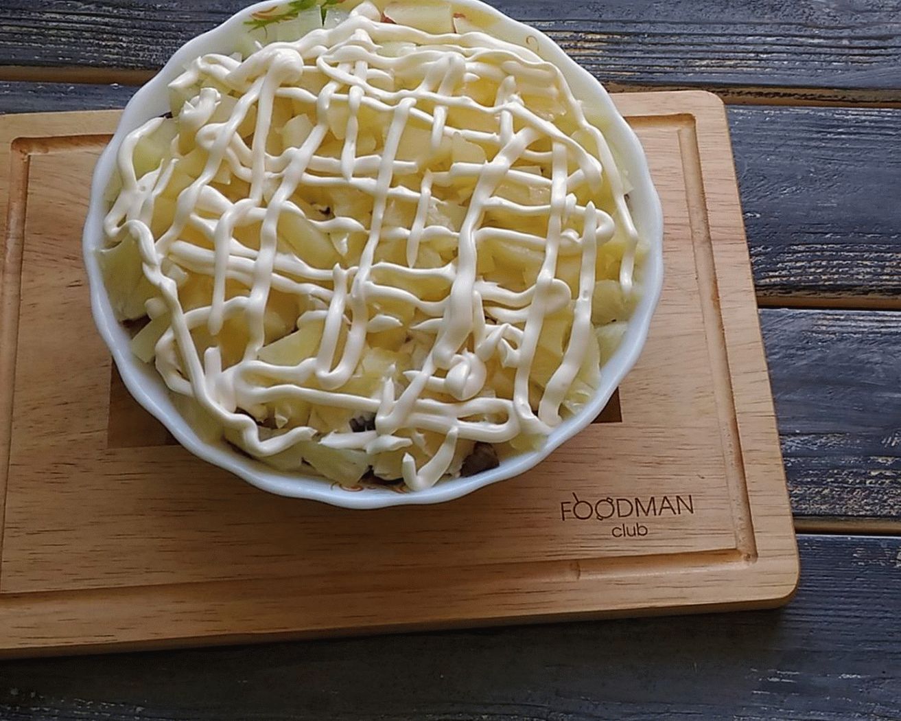 - 4 couches – couper les ananas en conserve en morceaux. Recouvrez la salade de graisse avec de la mayonnaise.