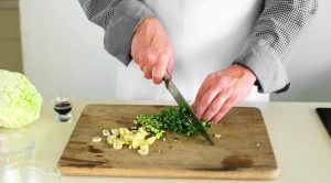 - Poivron coupé en paille très fine, concombre aussi couper en fines lanières, ajouter aux autres légumes. Vert hacher finement l’oignon et mélanger avec la salade.