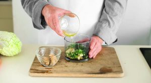 - Mettez la coriandre, l’ail et le gingembre dans un bol. Ajouter miel, vinaigre, jus de citron vert et sauce de poisson. Fouet Ajouter la cacahuète coller et fouetter à nouveau jusqu’à consistance lisse.