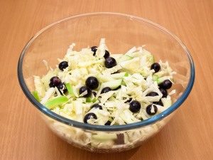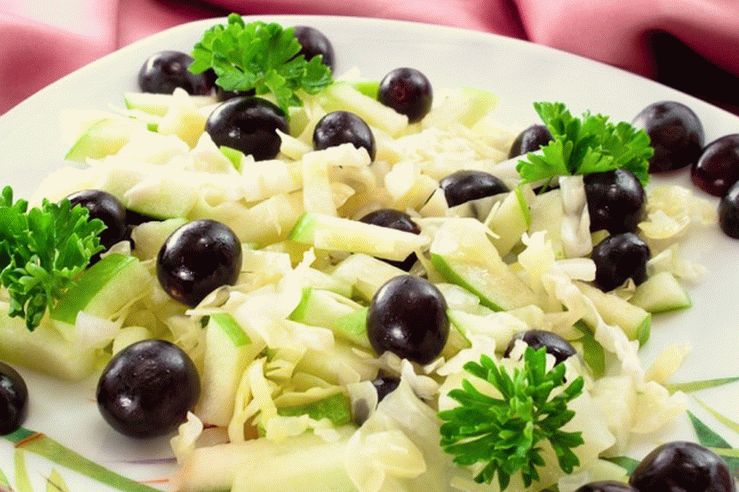 - Ajoutez-y du chou fin, des raisins sans piquée (partie laissée pour la décoration), saison à l’huile d’olive première pression à froid, mélanger.