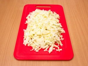 - Peler le chou des feuilles supérieures, couper couper en deux, couper, hacher finement avec un couteau ou une grille sur une râpe avec une buse spéciale.