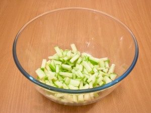- Éplucher la pomme, couper en deux, retirer noyau avec des noyaux, coupé en pailles, saupoudrer de jus un demi citron, remuer.