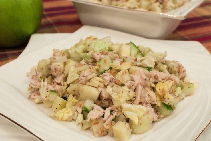Salade de poulet bouillie savoureuse et saine au goût rafraîchissant concombres frais et une touche de piquant de noix. Tout à fait possible cuisiner pour un dîner léger à la maison.