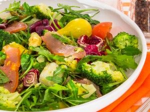 - Dans un grand saladier, mélanger le carpaccio, les tomates, le brocoli, asperges, laitue.