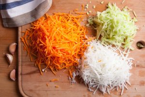- Épluchez l’ail, hachez-le finement ou utilisez un presse-agrumes. Dans dans un bol, mélanger les légumes et l’ail.