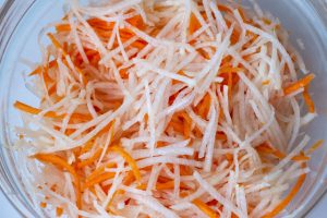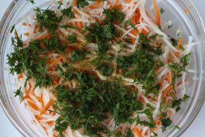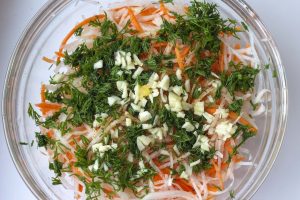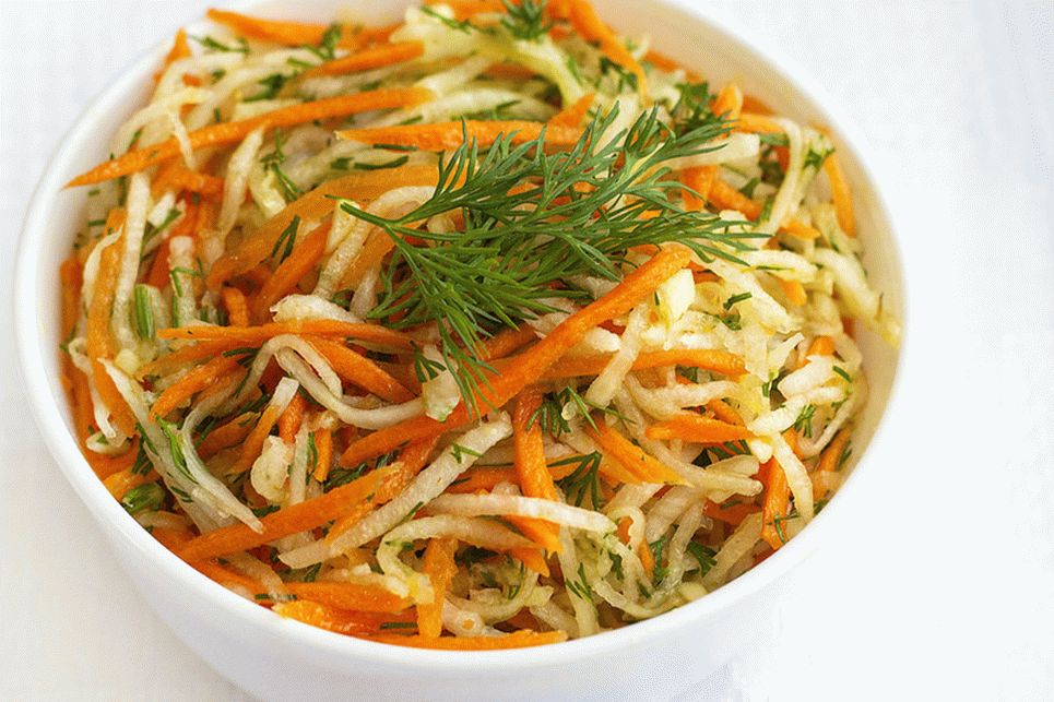Une délicieuse salade de daikon aux carottes peut être excellente une collation ou un ajout à la viande, au poisson ou barbecue. Une telle salade peut être préparée à la fois à la maison et à la campagne, ou avec vous sur un pique-nique. Cela se fait très rapidement et facilement. même une jeune maîtresse. Il s’avère en bonne santé, vitamine, frais salade