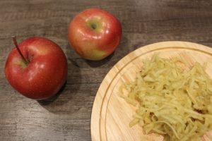 - Nous retirons la pelure de la pomme et la frottons sur une râpe grossière, envoyer dans un bol, mélanger.