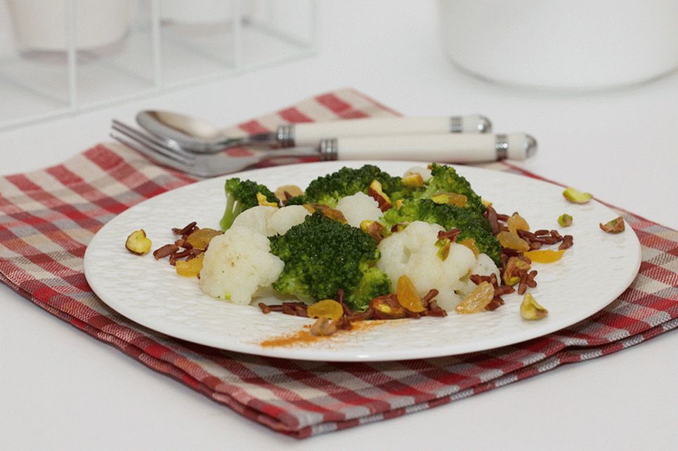 Le brocoli et le chou-fleur peuvent être servis non seulement comme accompagnement le plat chaud principal. Je recommande de faire une délicieuse salade à la maison brocoli aux graines de sésame et aux pistaches. Je te conseille de le faire plat original et insolite aussi avec graines de sésame parfumées l’huile.