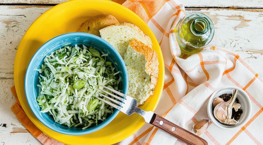 - Lavez l’aneth et les oignons verts, séchez-les et hachez-les finement. Mélanger avec chou. assaisonner avec du poivre noir au goût et des légumes l’huile.
