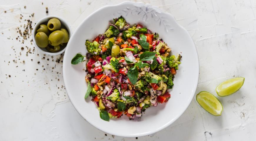 - Mélanger tous les ingrédients dans un bol profond, ajouter le sel et poivre, tout mélanger. La salade peut être servie immédiatement ou à gauche au réfrigérateur pendant une heure.