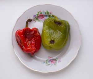 - Lavez les poivrons, séchez-les et faites-les cuire sur le gril ou au four à une température de 230 degrés pendant environ 3 minutes. Étaler dans un paquet pour se refroidir.