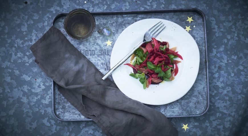 - Mettez les betteraves restantes hachées finement dans une assiette. Ajoutez la salade fraîche et servez.