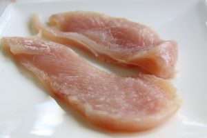 - Couper le filet de poulet en tranches, saler et faire frire casserole sans huile pendant 2 minutes de chaque côté.